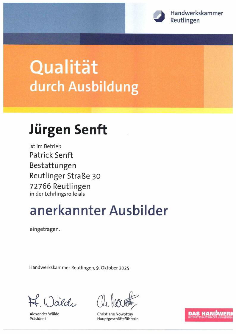 Seit 09. Oktober 2025 anerkannter Ausbildungsbetrieb für den Beruf Bestattungsfachkraft. Eingetragen in der Handwerkskammer Reutlingen.